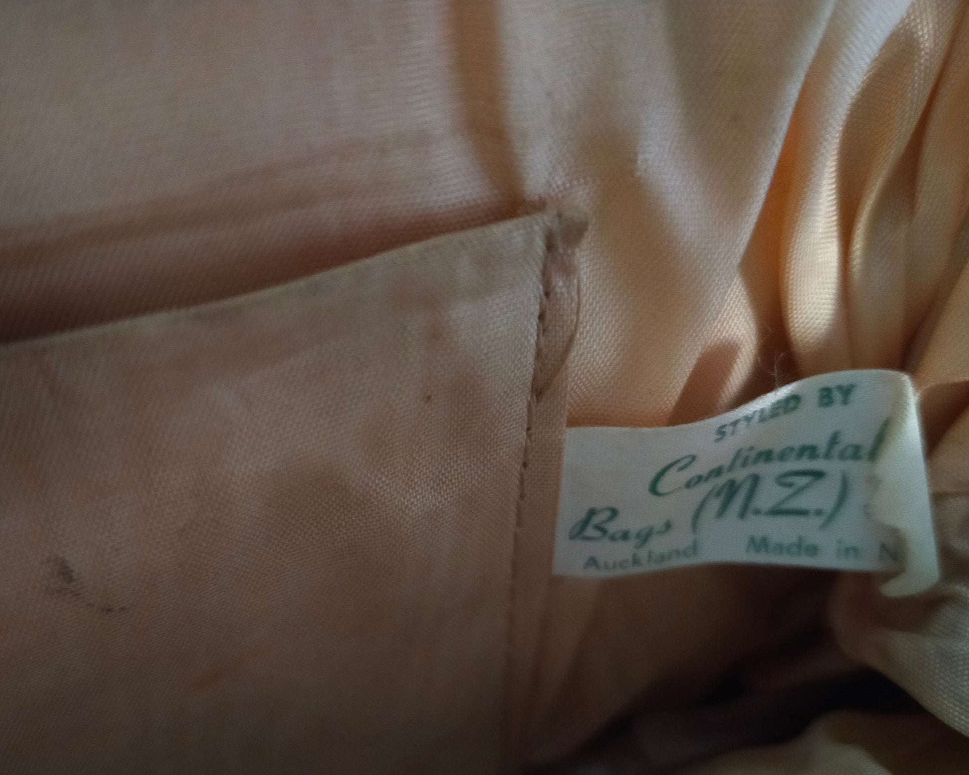 This bad is very queen-like, although I doubt any of her bags were vinyl! This bag is styled by Continental Bags (N.Z.) Ltd in Auckland. It has a rayon lining and a pocket for a mirror. It's in good condition for its age. There is a tiny crack (2mm) on the underside of the strap.