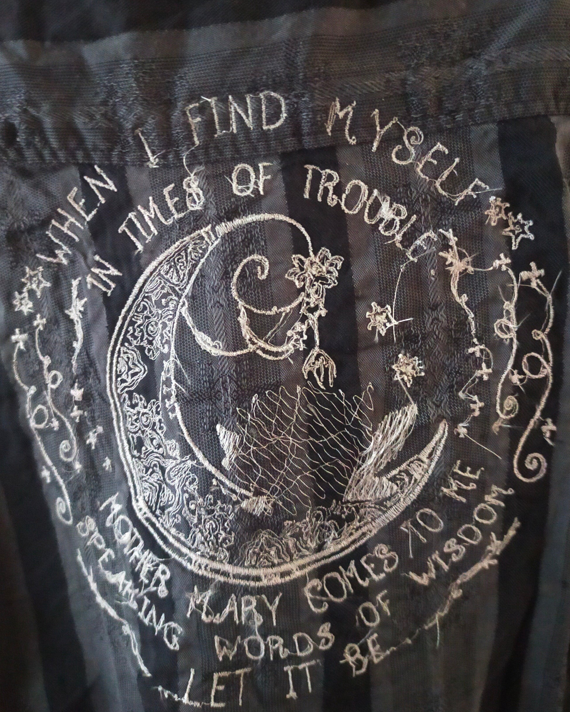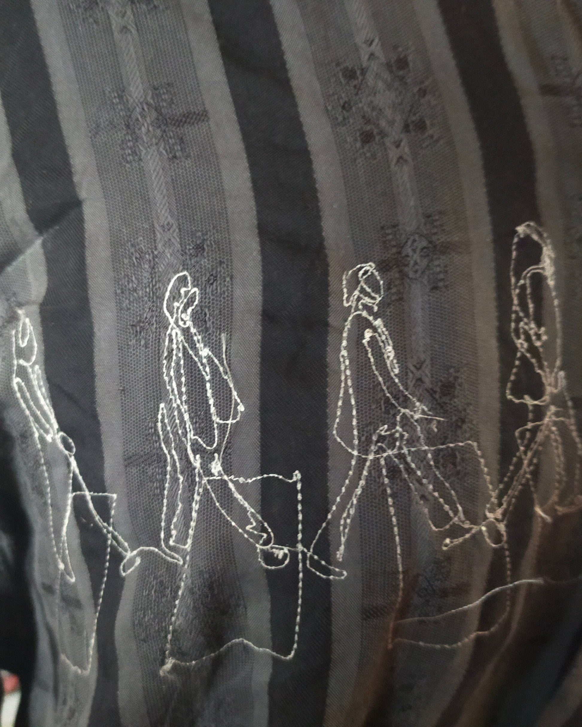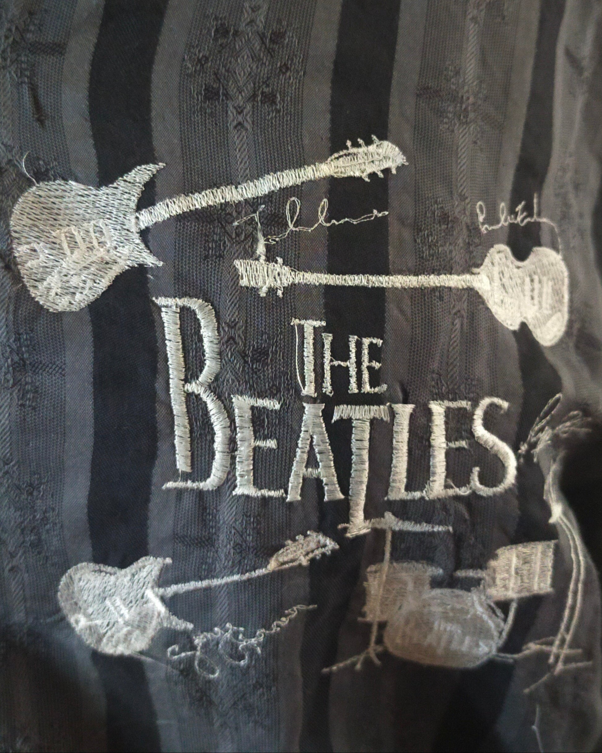 This is a reworked long-sleeved 100% cotton shirt with a mandarin collar that is an homage to the Beatles. It is embroidered with 3 designs that represent the Beatles.