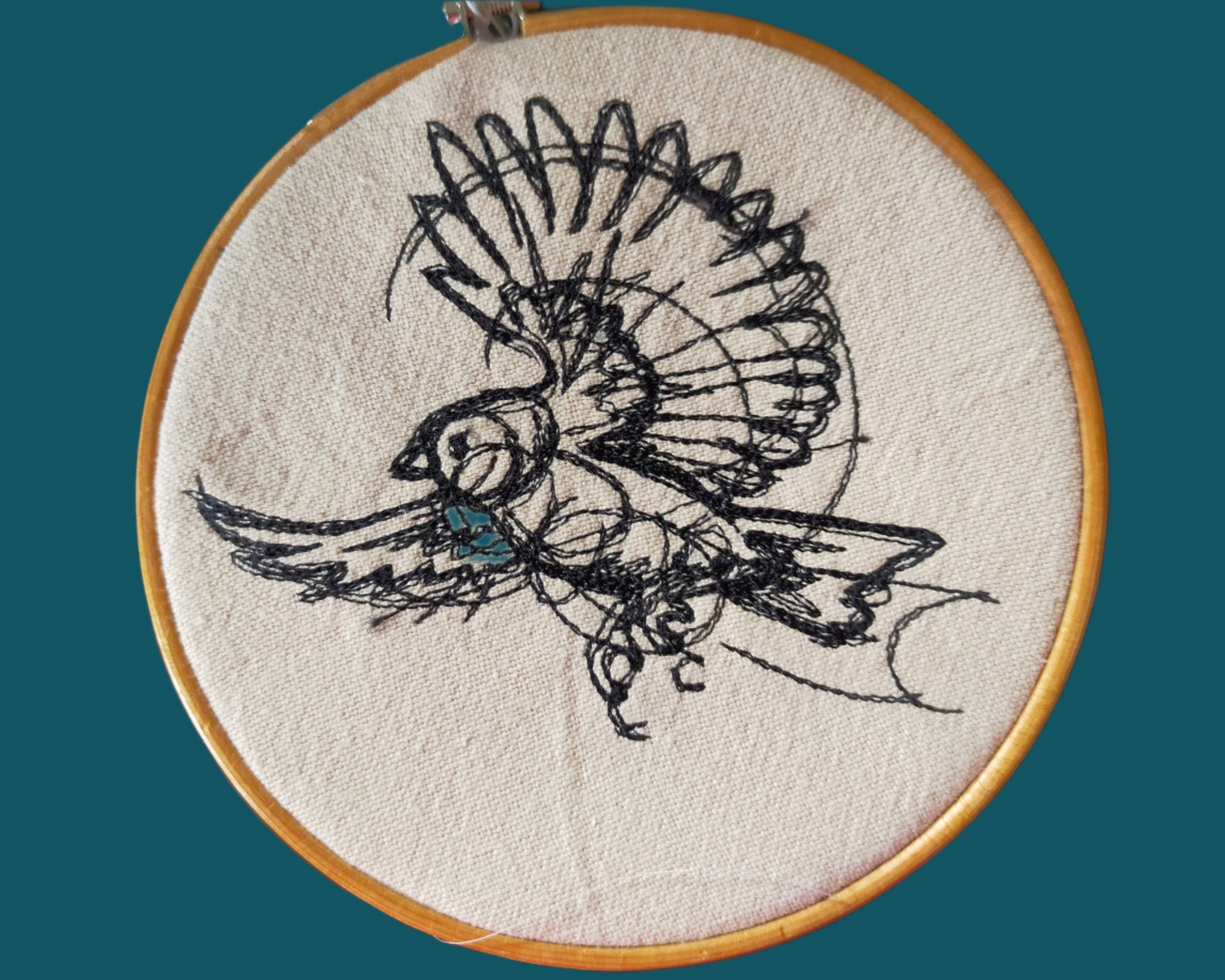 A bird on the wing. Take flight with this small embroidered sketch. Perfect for that little corner. Embroidered hoop not included. Your embroidered piece will arrive unmounted.