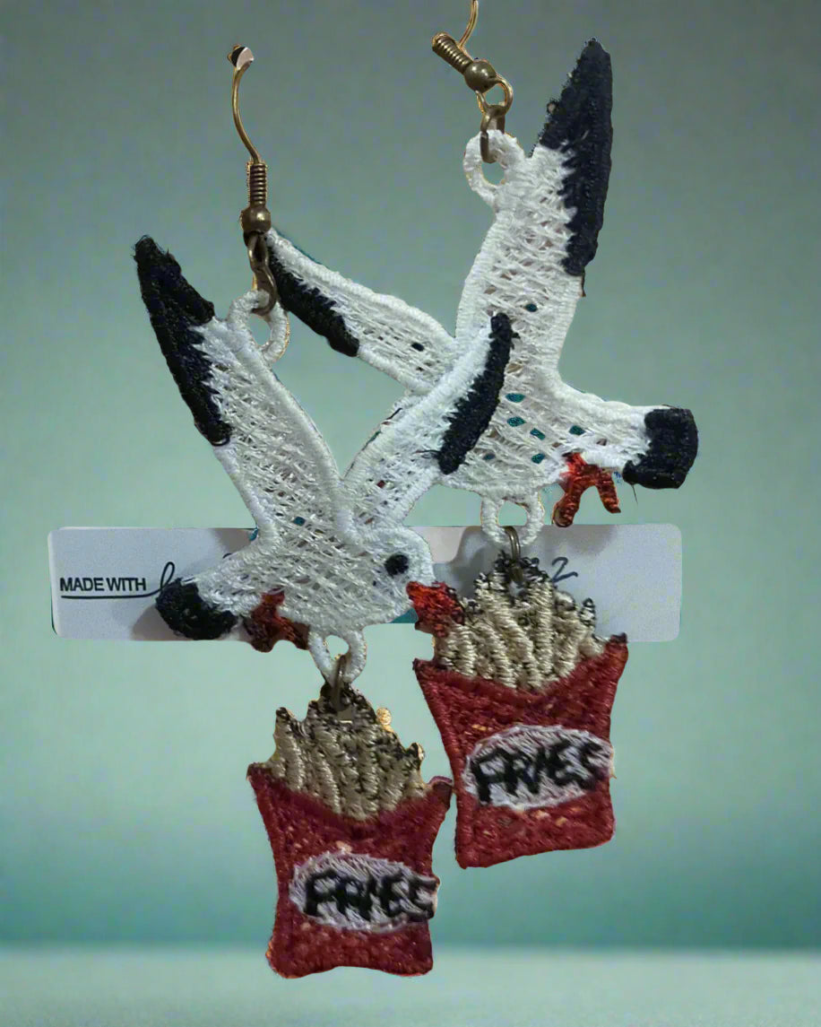 Turn that annoying (and frankly terrifying) ordeal of having to defend your food from sky rats with these lace dangly earrings.