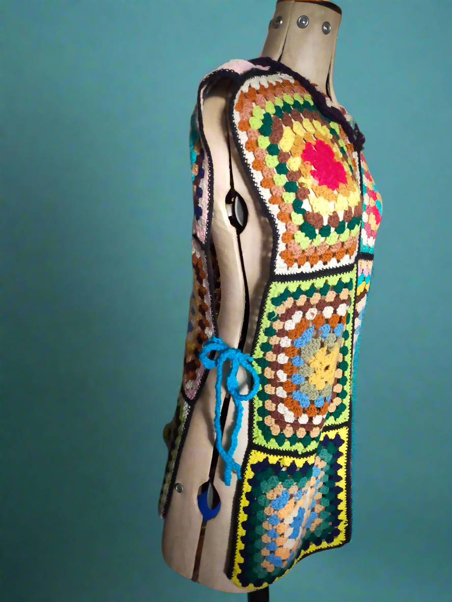 Here is a quirky tabard to brighten up your outfit. This unique and flattering piece is made to slip over a shirt or jumper and still have the undershirt visible.