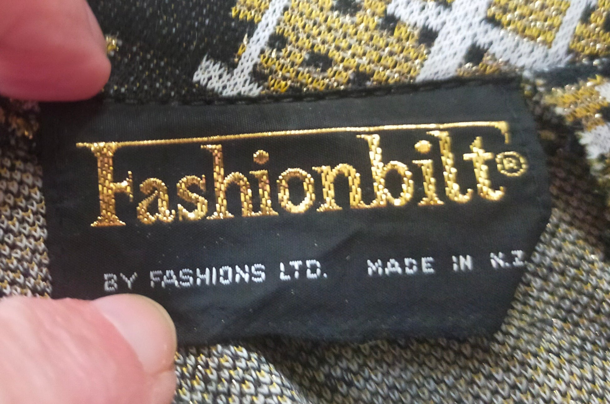 Wearing black in winter can still be a sparkly affair in this immaculate 1960s black and gold dress. Knit fabric with some stretch. It zips down the back and has a belt. Made by Fashionbilt (NZ).