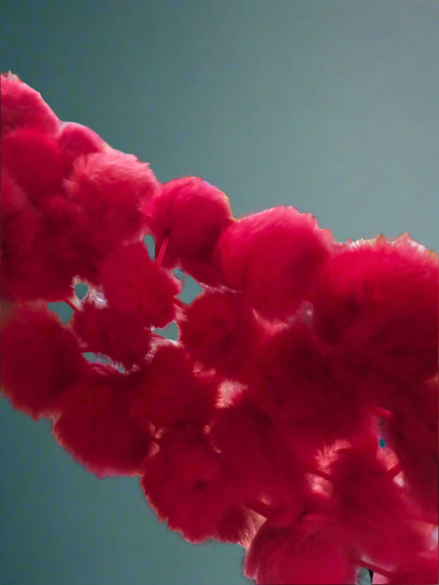 Bright and warm red possum pompon scarf. Made by Seriously Twisted in Dunedin, this unusual scarf is soft and warm.