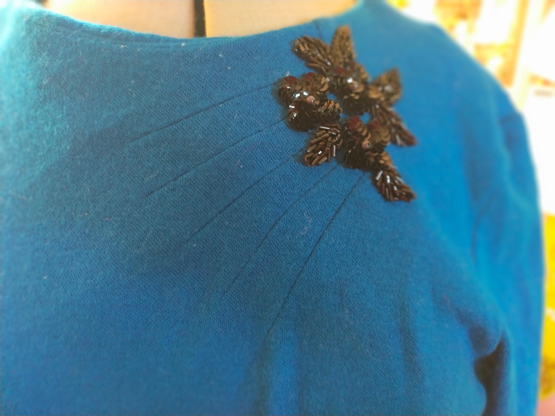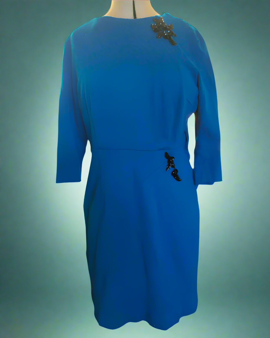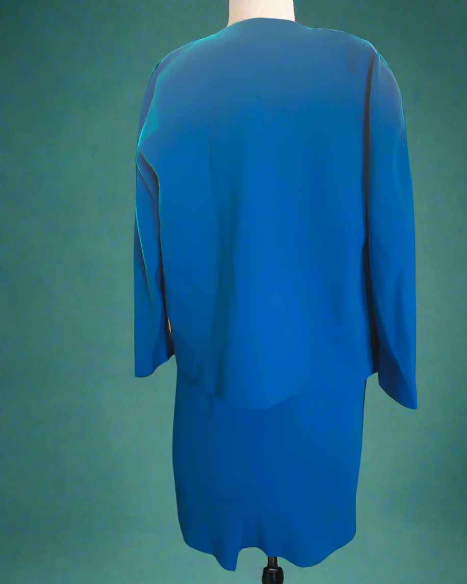 What a smart 2 piece ensemble; perfect for work. It feels like a heavyweight wool blend. The dress has both a side zip and a small zip down the back, while the jacket is open with no fastenings. Both the dress and the jacket have black sequin embellishments. place. There is also a subtle dart detail.